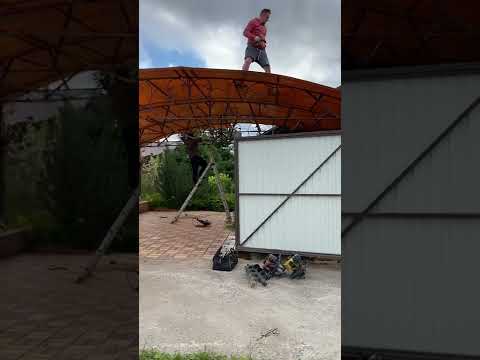 Навес из поликарбоната для двух автомобилей + откатные ворота